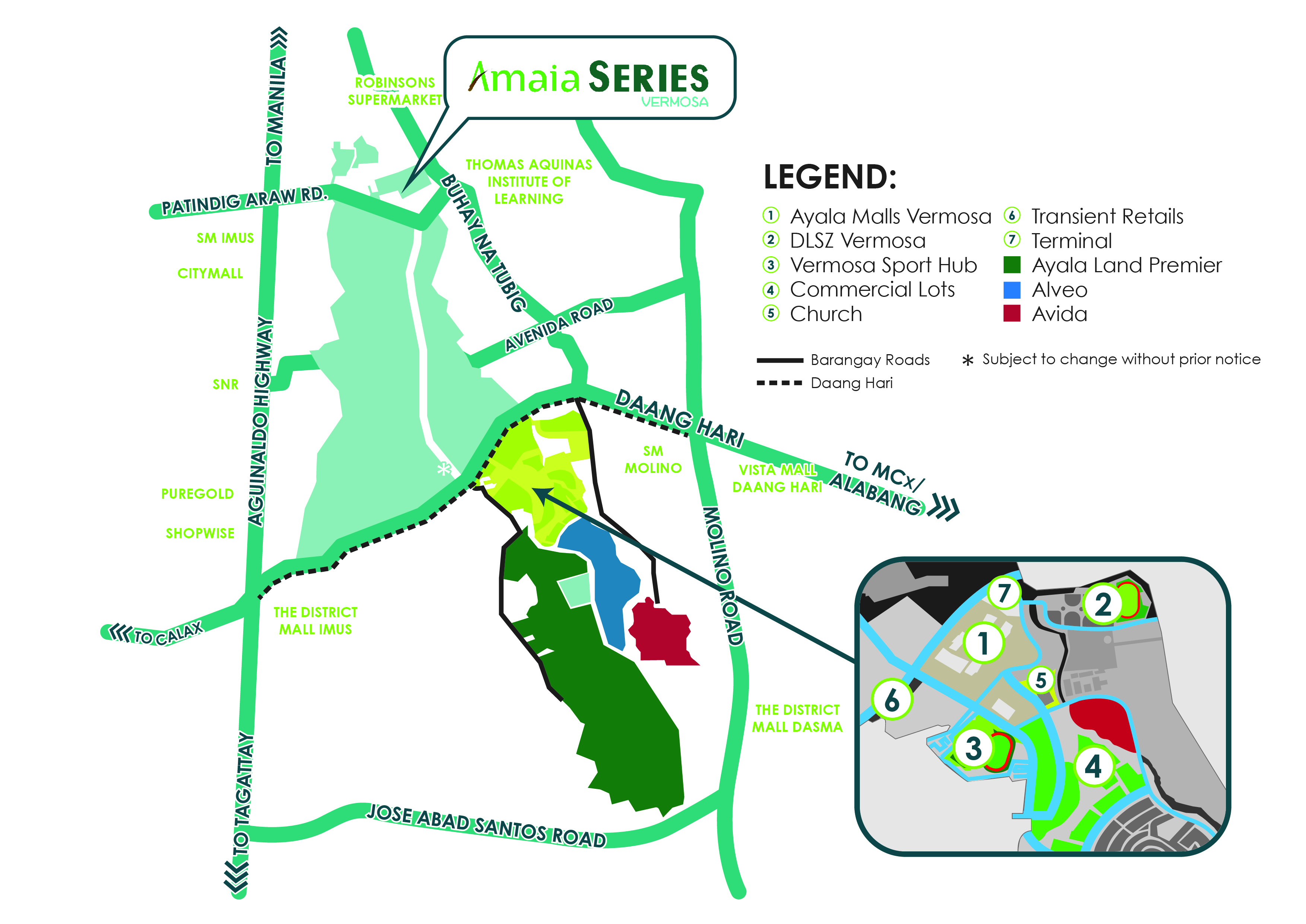 Vermosa Midtown features the following developments: Vermosa Sports Hub, Ayala Malls Vermosa, De La Salle-Zobel Vermosa, Vermosa Church, Parks and Open spaces, and a transport terminal.