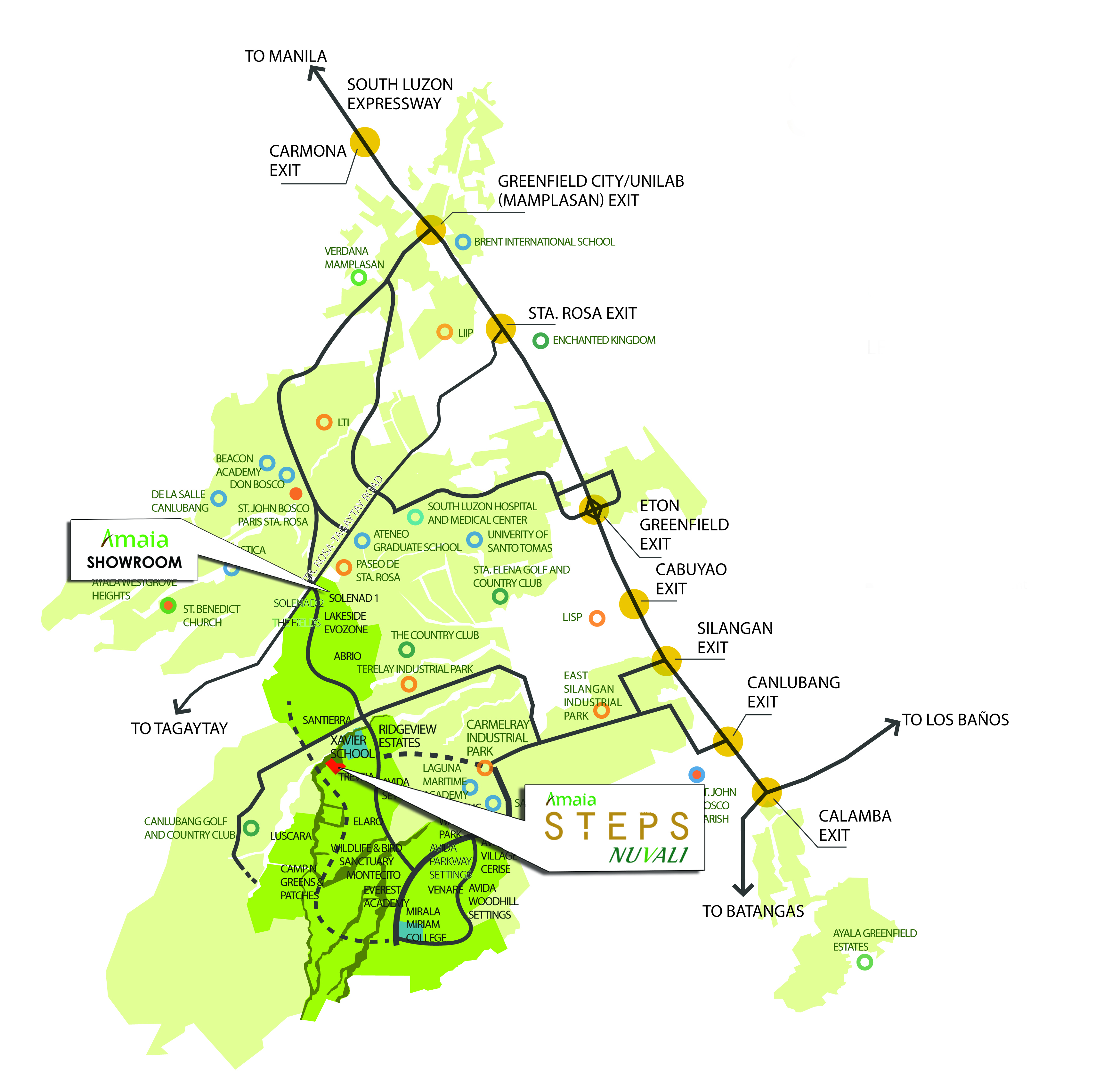 Amaia Steps Parkway is 5-minutes away from the main entrance of Nuvali, along Sta. Rosa Tagaytay Road. Its main access road is the Evoliving Parkway, a 26-meter major road that opens up along Sta. Rosa-Tagaytay Road.