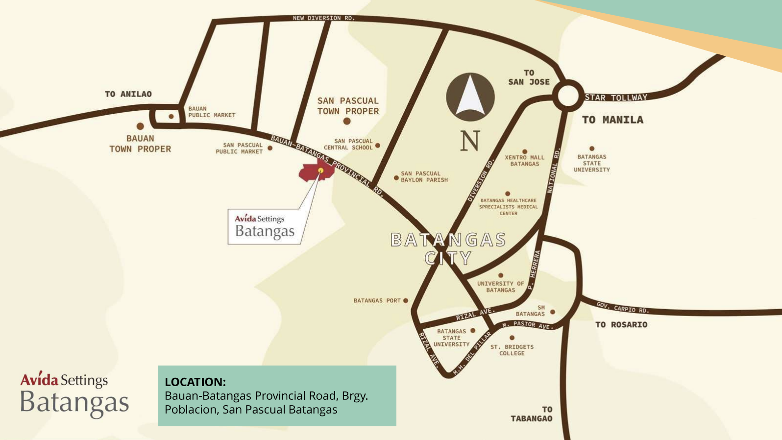 Location: Brgy. Poblacion, San Pascual, Batangas - Strategically located in San Pascual town proper between Bauan and Batangas City, Avida Settings Batangas offers plenty of advantages for families.